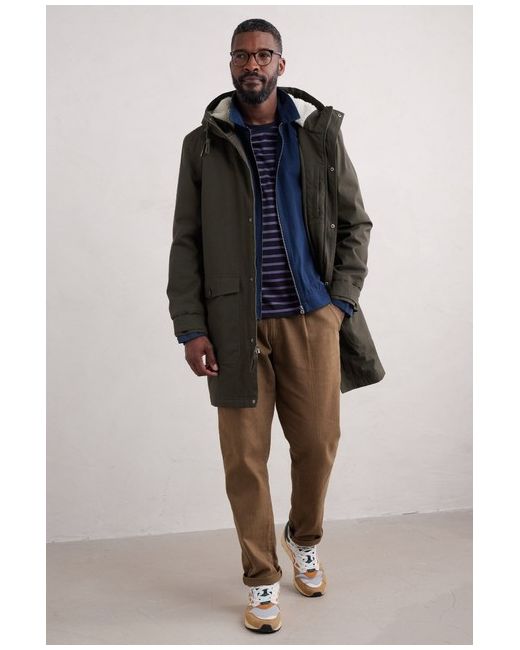 A hardy, longer length raincoat, designed to withstand the wildest Cornish weather. The Tidesman is lined with a lightly quilted recycled polyester, with a warm fleece lining across the upper back. Use the drawcord adjusters on the hood to keep out the rain and the extra side entry opening on the front pockets to warm your hands.