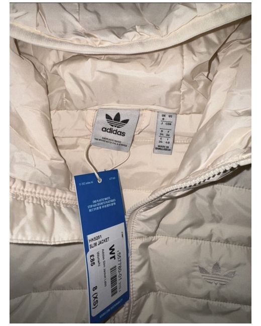 This Adidas jacket for women features a slim fit design with a quilted style in a beige colour. It is made of polyester, perfect for casual or travel occasions. The jacket has long sleeves with a zip closure, providing both style and functionality. With a size S and regular size type, this new-with-tags jacket is a stylish addition to any wardrobe.