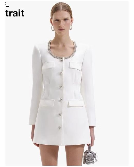 This Self-Portrait women's suit dress in size 8 is a stylish and chic option for a party or cocktail occasion. The dress features a zip closure, a short length, and a mini style, making it perfect for summer events. The white colour adds a touch of elegance, and the brand's reputation for quality ensures that this dress is sure to make a statement. Made in China, this regular fit dress is a versatile choice for any fashion-forward woman looking to stand out from the crowd.