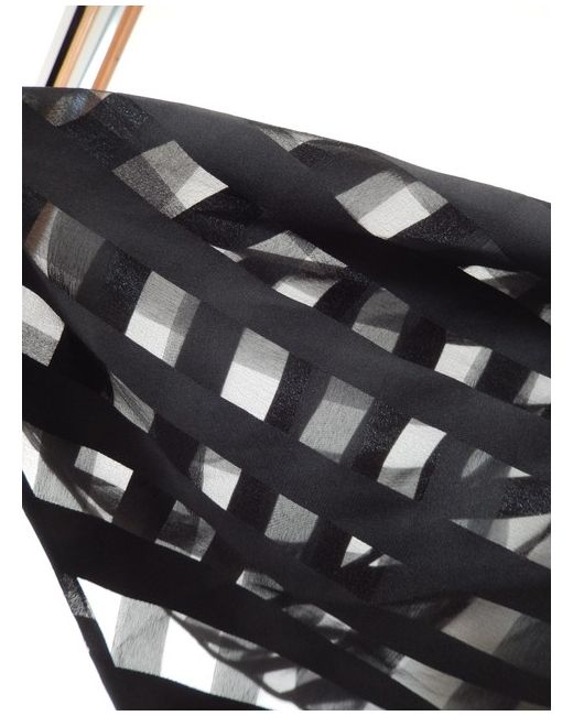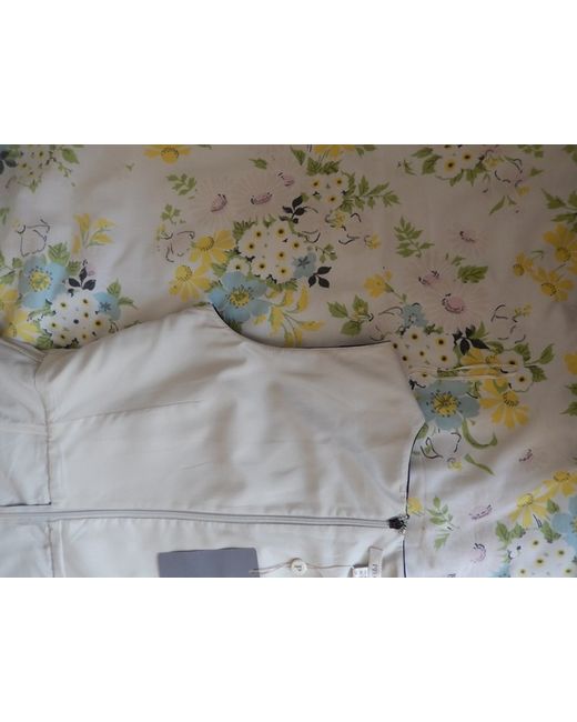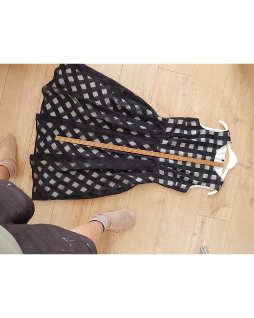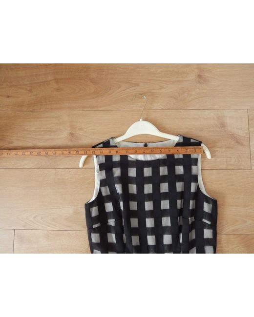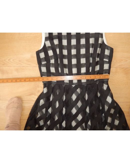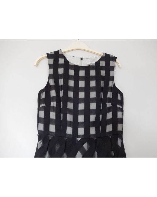 Precis evening dress in size 8 has an outer fabric that is see-through in a black and clear check banding of colour. The fabric/lining underneath is off white which is visible through the clear parts of the outer fabric.
