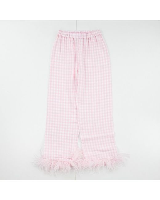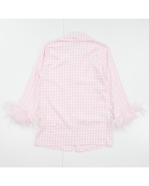 The Sleeper Party Pajama Set in Pink Vichy features a chic collared neckline and feather accents on the sleeves. Made from 100% viscose with ostrich feather detailing, it offers comfort and style for your nightwear collection. Ideal for autumn and winter seasons, this set is handmade in Türkiye and is designed for women who appreciate luxury loungewear. Perfect for gifting or treating yourself to a cozy night in.