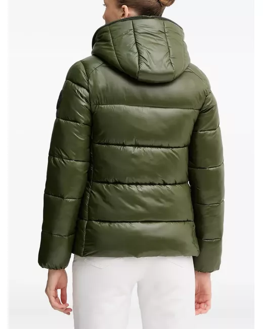 olive green padded design quilted finish hooded design zip fastening side pockets logo patch long sleeves