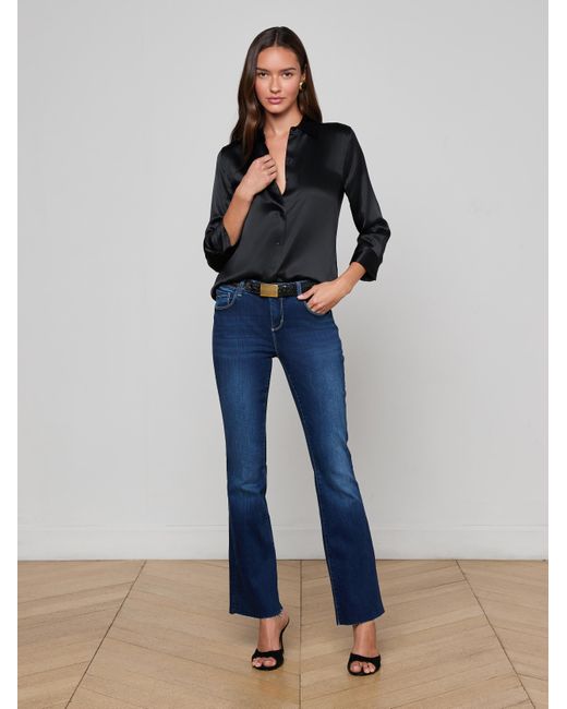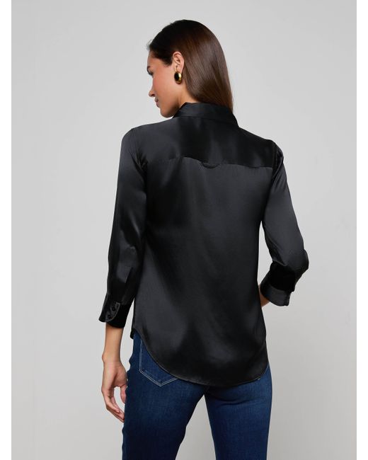 A classic button-down blouse with a luxurious, light catching luster. Black charmeuse silk drapes effortlessly to a shorter, curved hem. Three-quarter-length sleeves and a relaxed open collar balance elegance with wearability. 100% silk. L'AGENCE Dani Silk Blouse Top In Black