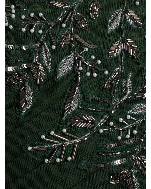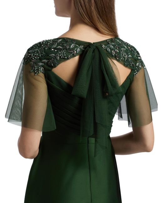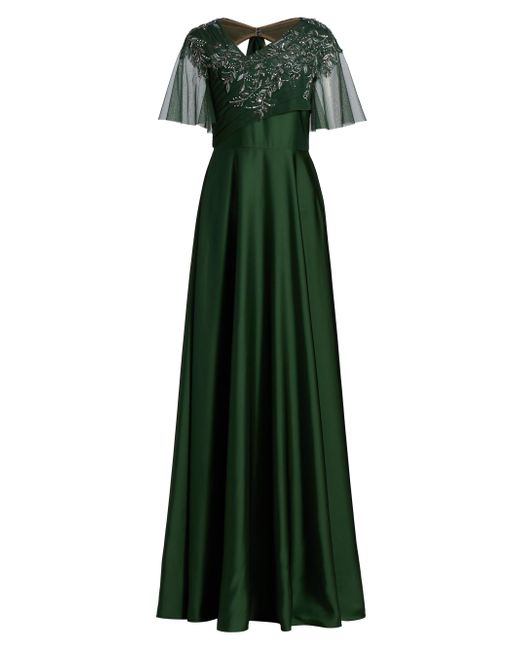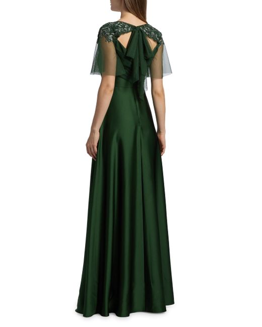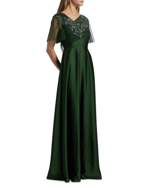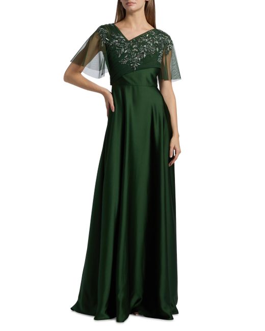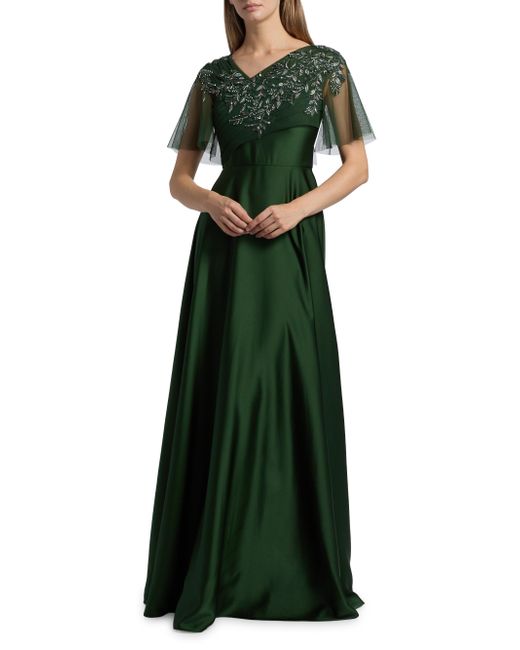 The Nerissa gown from Theia features an asymmetric V-neck embroidered with sparkling beading. Short tulle flutter sleeves and a back self-tie detail lend added feminine detail to this A-line silhouette. Asymmetric V-neck Short flutter sleeves Back zip, tie closure 100% polyester Dry clean Imported SIZE & FIT About 63.25" from shoulder to hem Model measurements: 5'10" tall Model is wearing a US size 4 ABOUT THE BRAND Inspired by the Greek goddess of sight, designer Don O'Neill launched Theia in 2009 in hopes that his elegant evening dresses would bring out every woman's inner goddess. Occasionwear at its finest, the brand's gowns are crafted of luxurious silks, with brocades and laces embellished with stunning beading and embroidery. Dress Collections - Theia > Theia > Saks Fifth Avenue. Theia. Color: Moss Green. Size: 6.