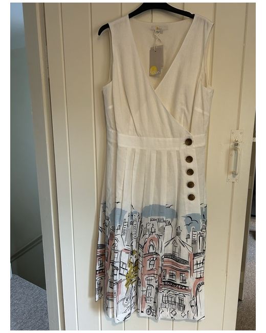 This Boden Women's Dress in size 16R features a unique print in white with pastel tones, making it perfect for a casual occasion in the summer or spring. The sleeveless design and knee-length fabric offer comfort and style, with the A-line silhouette adding a feminine touch. This dress is a classic choice for any woman's wardrobe, combining quality, style, and versatility.