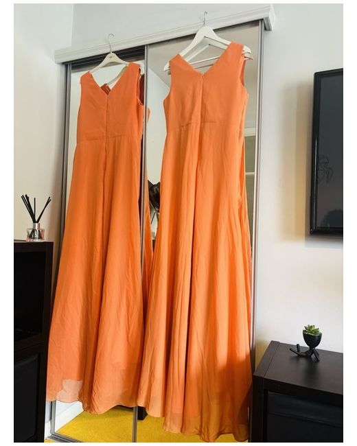 Two beautiful stunning orange long mermaid v-neck dresses for occasions such as a prom, banquet evening or a wedding. Size UK 16 and size UK 18.