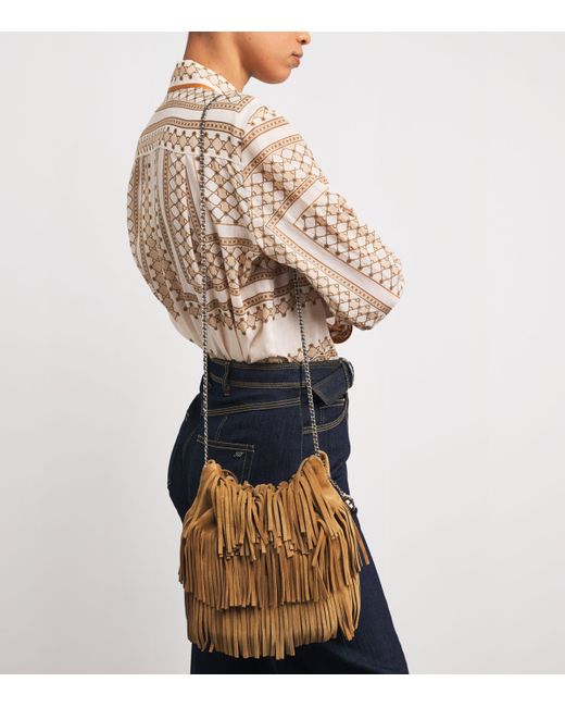 Fringing has been a key trend in the fashion world of late, and Tory Burch puts its own spin on it with the Fleming top-handle bag. Cut to mini proportions, this slouchy silhouette is a vintage-inspired piece featuring a cross-body strap and twin top handles that offer a plethora of styling options.