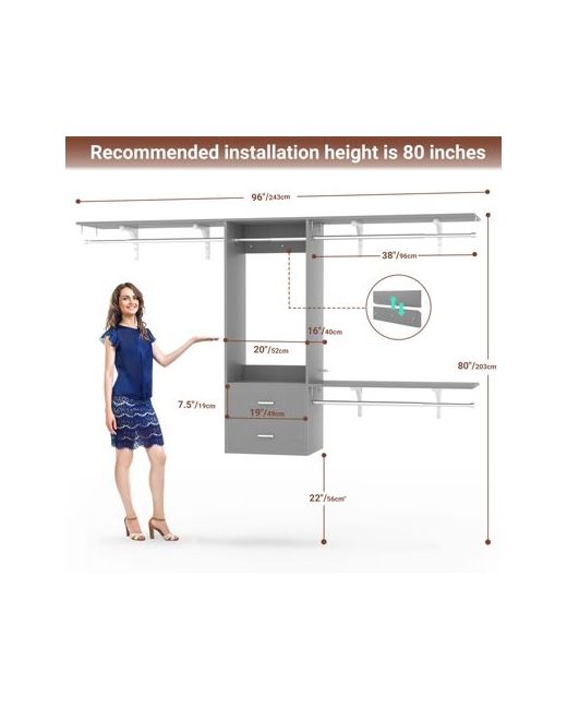 This 8FT wall-mounted closet organizer system is the perfect upgrade for your closet. Made from high-quality P2 engineered wood and metal, it has a weight capacity of 600+ lbs and comes with three high-strength extendable hanging rods and winged shelves (which can be cut to fit), easily accommodating over 350 garments. Two wooden drawers provide ample private storage space. The top of the wing brackets offers spacious storage for storage boxes and travel bags. The textured finish is sleek and modern, complementing any room decor. This closet rack offers a customizable storage solution for your closet.