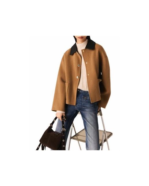 Classic lines are making a statement this season in structured materials and precious finishes. This short double-faced wool jacket is given a twist with a removable leather collar and gold buttons.