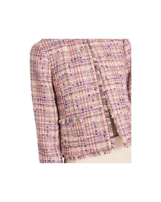 Define your style with this collar less cropped jacket from Tahari Asl, made from a boucle fabric. Shoulder padding and a hook-and-eye closure create a structured and modern silhouette. Two waist pockets complete the chic design.