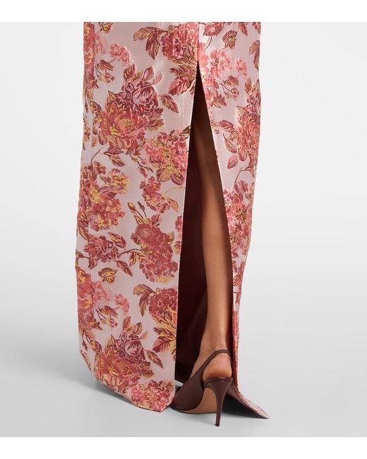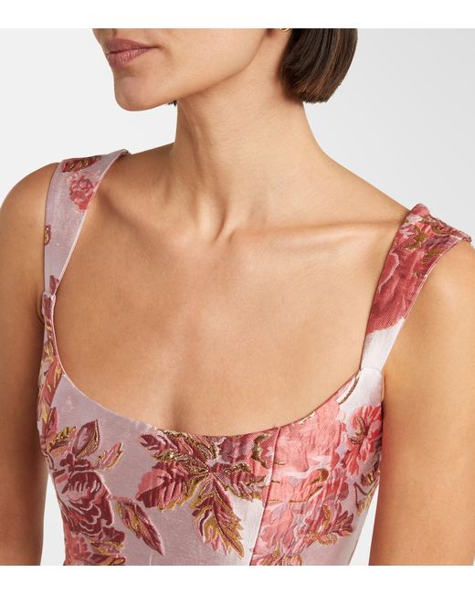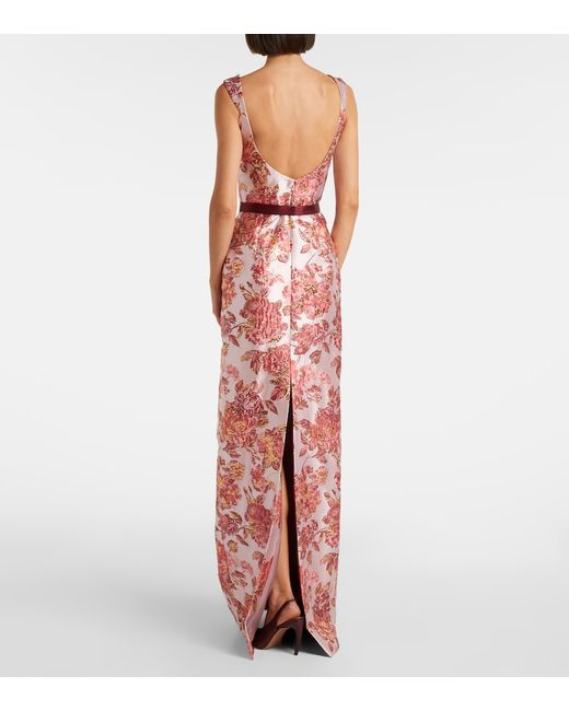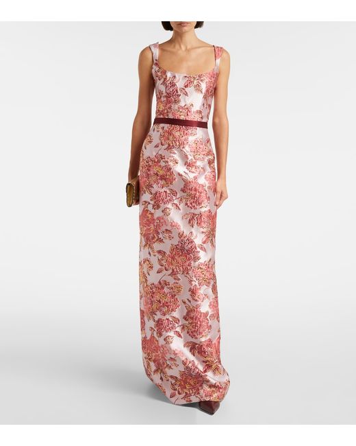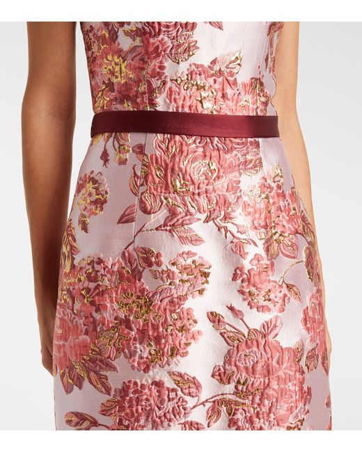Material: 72% polyester, 15% metallic fibres, 13% nylon. Care instructions: dry clean. Made in the USA. Designer color name: Pink. Item color: pink, burgundy. Lining: 100% silk. Attached belt. Boning. Closure: concealed zipped back. Long vent.