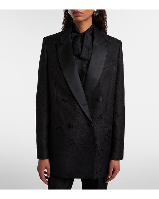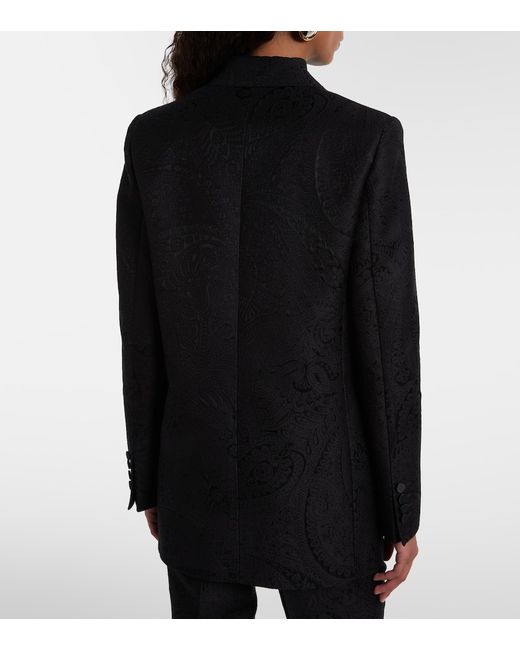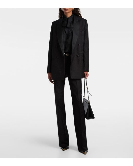 Material: 37% viscose, 32% polyester, 30% cotton, 1% elastane. Care instructions: dry clean. Made in Italy. Designer color name: Black. Item color: black. Material II: 100% polyester. Lining: 52% viscose, 48% acetate. Closure: double-breasted (four buttons). Contrast-trim lapel. Pockets: jetted, welt pocket. Shoulder pads.