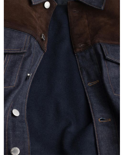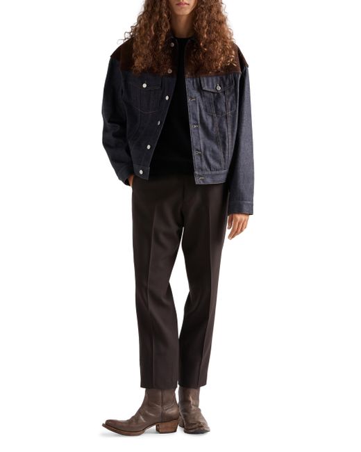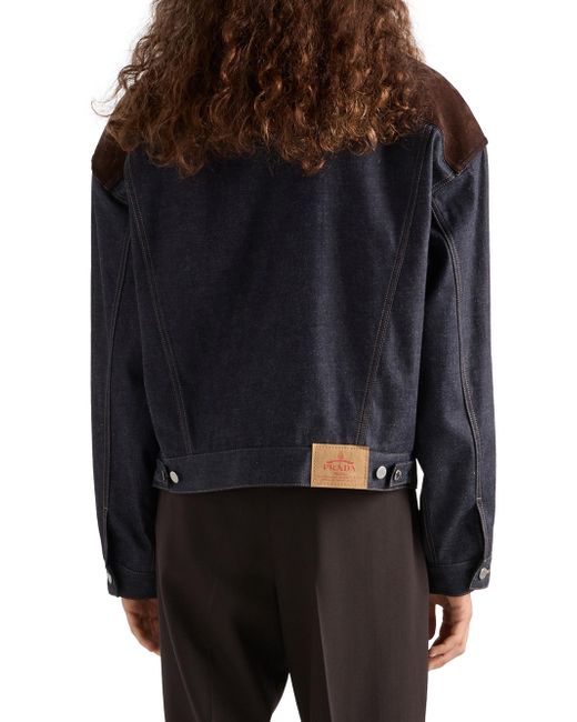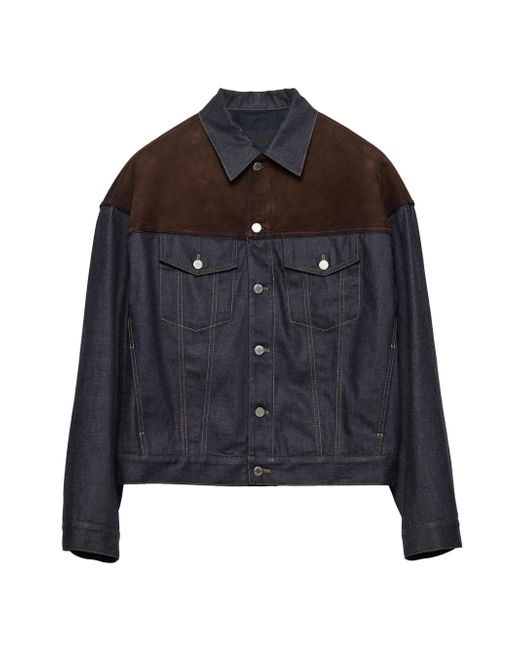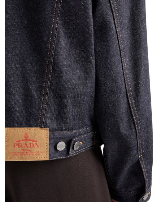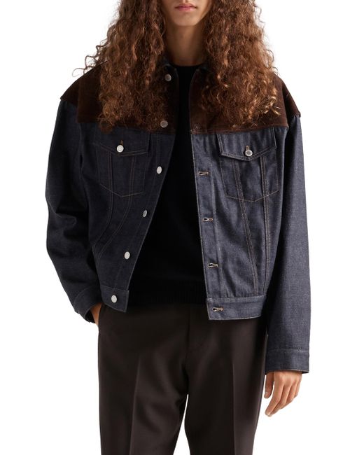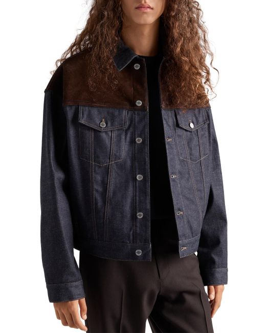 Raw denim treatment Classic fit Shirt-style collar Long sleeves, cuffs with button Front button closure Contrasting stitching Flapped patch pockets on the chest Low welt pockets on the front Center-back length: 64 cm. Size: M Adjustable straight hem with buttons Suede yoke Fully lined in cashmere Pressed garment Prada Milano logo label on the back Imported 100% Cotton - 100% Lamb leather. Lsd Rtw - Prada Rtw > Prada > Saks Fifth Avenue. Prada. Color: Blue. Size: XL.