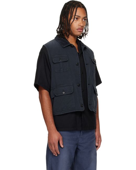 Non-stretch denim vest. · Subtle fading throughout · Corduroy spread collar · Button closure · Flap pockets at front and back Supplier color: Black