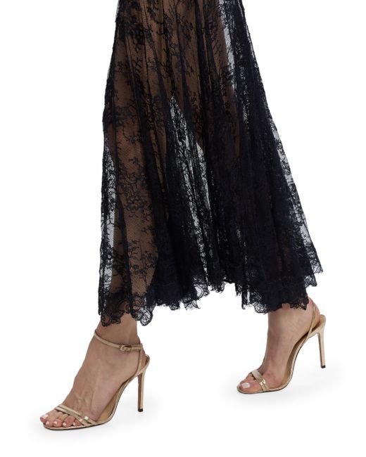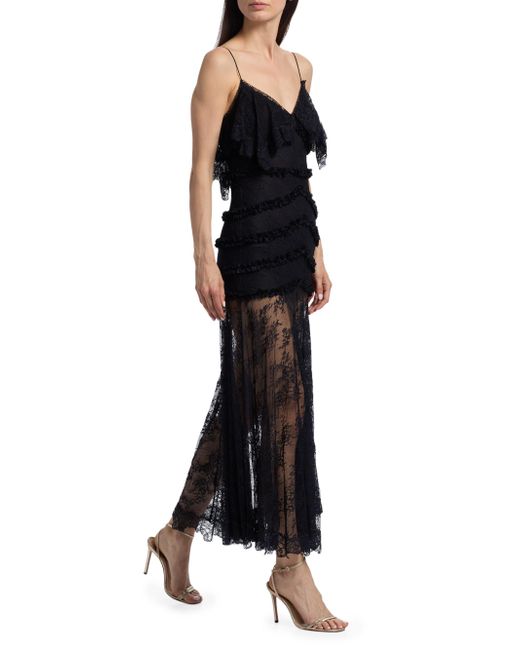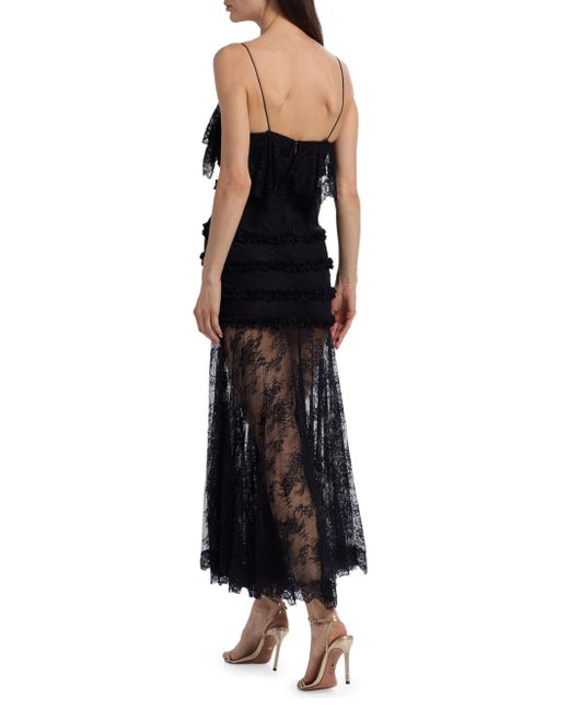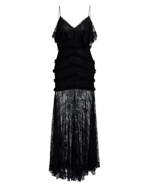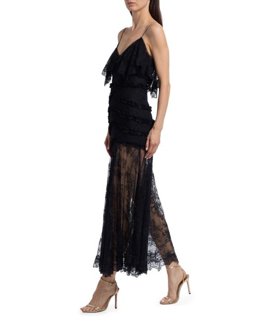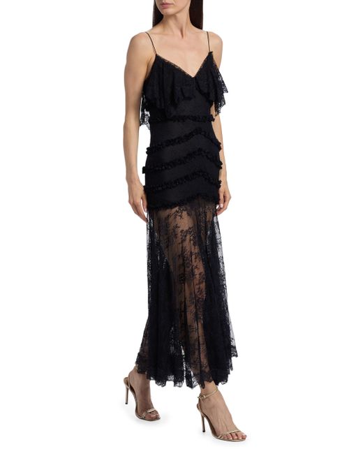 This Sandy maxi dress from LoveShackFancy features a V-neck, tiered lace detailing at the bodice, and a sheer pleated lace skirt. V-neck Spaghetti straps Concealed back zip closure 100% nylon Dry clean Imported SIZE & FIT About 53.25" from shoulder to hem Model measurements: 5'10" tall Model is wearing a US size 4. Contemporary Sportswear - Trend > Loveshackfancy > Saks Fifth Avenue. LoveShackFancy. Color: Black. Size: 00.