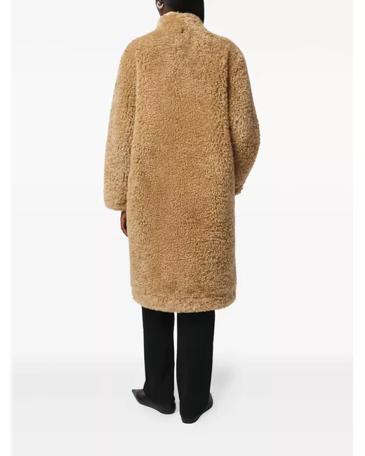 light brown bouclette texture high neck concealed front fastening long sleeves straight hem