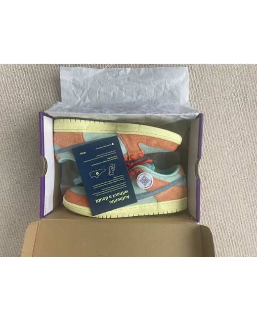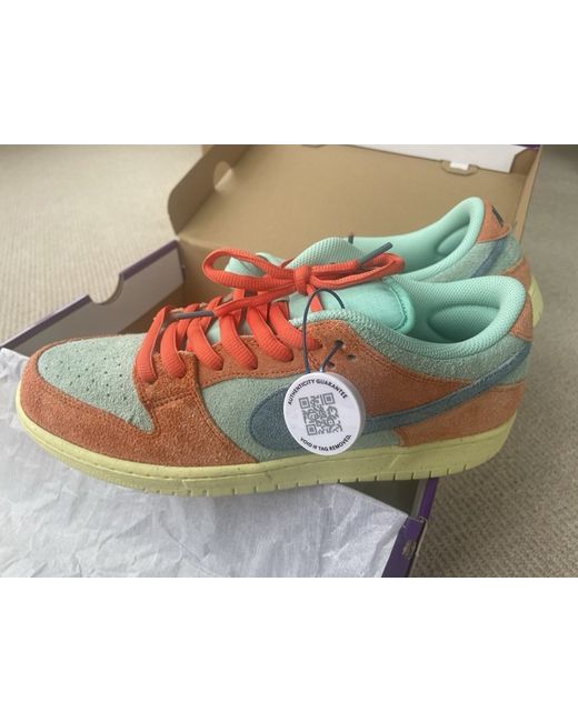 Looking for a stylish and comfortable sneaker?. Check out these Nike SB Dunks in a vibrant orange and aqua colorway. With their sturdy construction and cool design, you're sure to turn heads wherever you go.