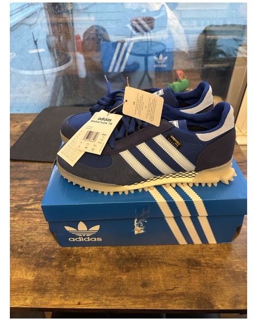 For sale one pair of brand new in the box Adidas Marathon TR, size uk 7.5 blue with sky blue stripes with a jelly sole, cordura fabric, with all tags , 100% genuine uk bidders only no returns