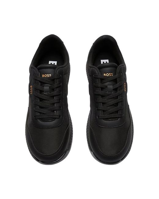 The BOSS Titanium Runn Trainers in Black feature woven synthetic uppers with coated fabric overlays that mimic genuine leather. They include a woven lace fastening, a heel panel adorned with BOSS embroidered stripes, and an embossed BOSS logo on the tongue.