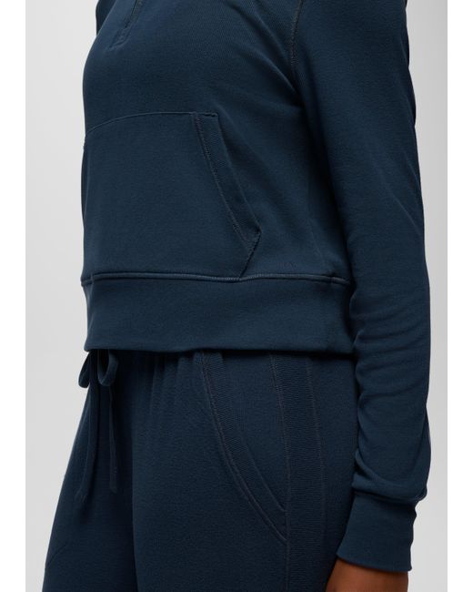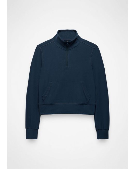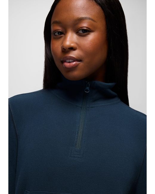 A relaxed half-zip sweater in a soft, luxe baby rib TENCEL™ modal blend. Layer up before your workouts or on days in between with the Willow West Half Zip. Designed with a luxurious rib TENCEL™ modal blend, it has a relaxed fit and gorgeous drape. Finished with a front kangaroo pocket, 1/2-zip neckline, and drop shoulders. | Womens prAna Willow West Half Zip in Navy Blue, Size Medium