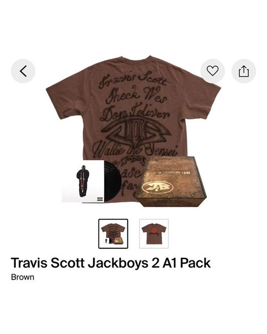 The Travis Scott Jackboys 2 Box Set is a stylish collection for men featuring a brown t-shirt in size small. This set is perfect for fans of the popular rapper Travis Scott, offering them a unique and fashionable addition to their wardrobe. The sleek design and high-quality materials make this box set a must-have for any music lover or fashion enthusiast looking to add a touch of edgy style to their look.