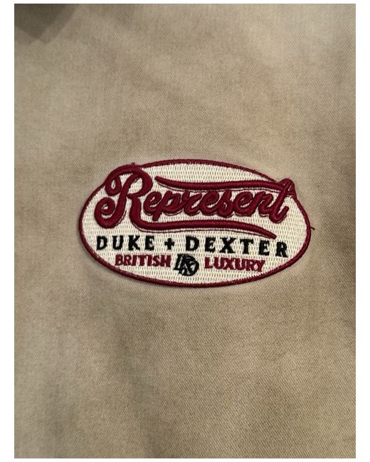 The Represent x Duke Dexter Carpenter Jacket in size small is a stylish and authentic piece designed for casual occasions. Made from cotton with polyester insulation, this beige jacket features the logo accents and has a motorcycle jacket style. Perfect for the spring season, this jacket is a fashionable choice for men looking for a unique and high-quality addition to their wardrobe.