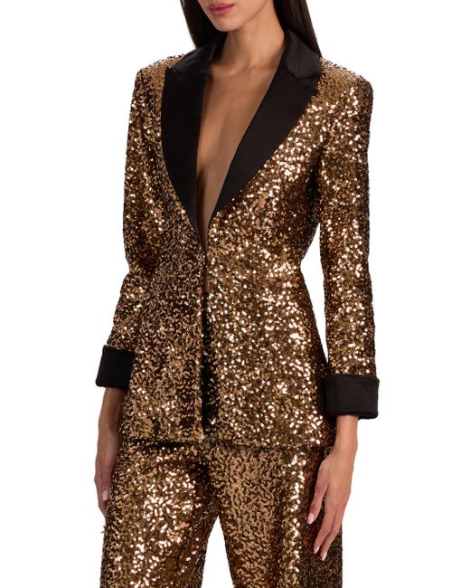 The Justin blazer from Alice + Olivia showcases a sequin-embellished design and is tailored in a slim-fit. Satin trim at the peaked lapels and rolled-up cuffs add flair to this look. Peak lapels Long sleeves, rolled-up cuffs Button-front closure 97% polyester/3% elastane Combo: 75% triacetate/25% polyester Lining: 100% polyester Dry clean Imported SIZE & FIT About 29" from shoulder to hem Model measurements: 5'10" tall Model is wearing a US size 4 ABOUT THE BRAND Founder Stacey Bendet has been embracing bold color, eclectic prints and an overall passion for whimsy since launching Alice + Olivia in 2002. From party-ready dresses to statement tops and everything in between, she's created a playful and overtly feminine aesthetic that's uniquely her own. Contemporary Sportswear - Alice + Olivia > Alice + Olivia > Saks Fifth Avenue. Alice + Olivia. Color: Gold Black. Size: 0.