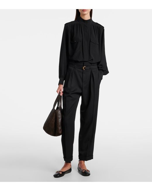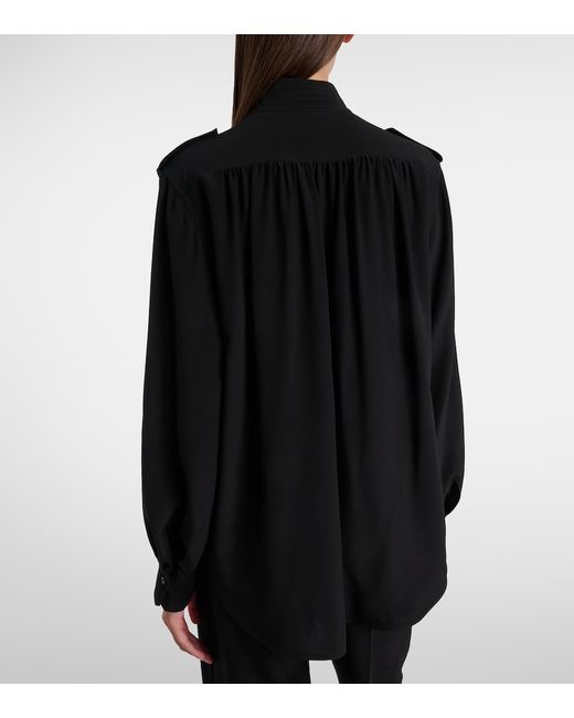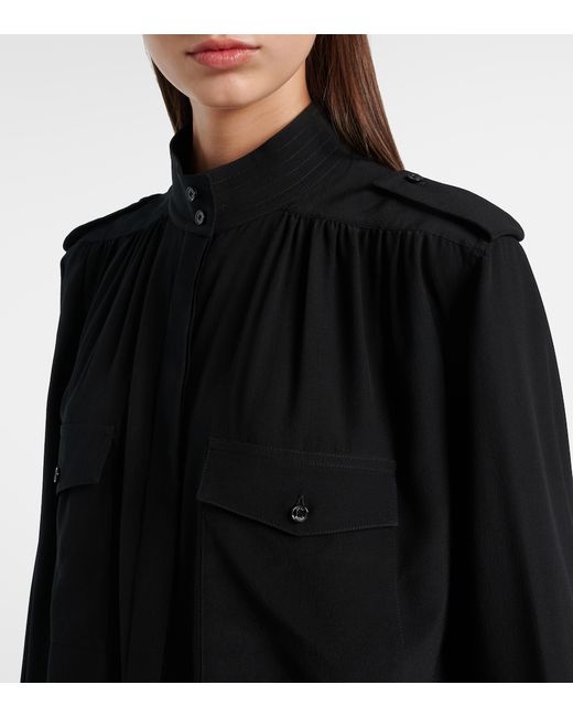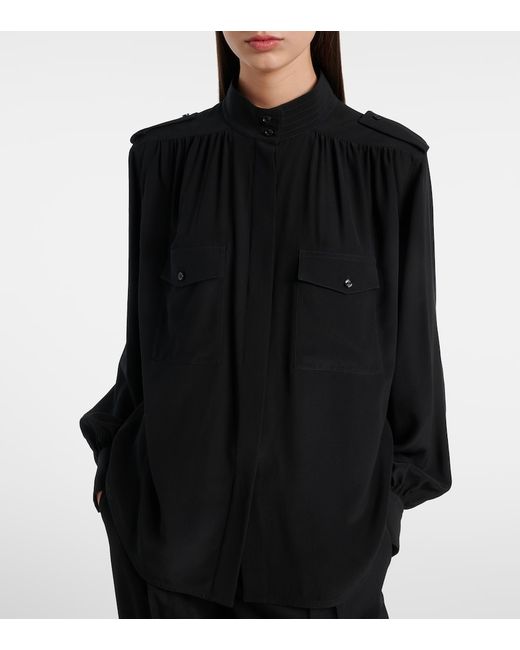 Material: 100% silk. Care instructions: dry clean. Made in Madagascar. Designer color name: Black. Item color: black. Details: 100% mother-of-pearl. Contains non-textile parts of animal origin. Silk. Collar: band. Cuff: buttoned. Pockets: flap chest pockets. Closure: buttoned placket.