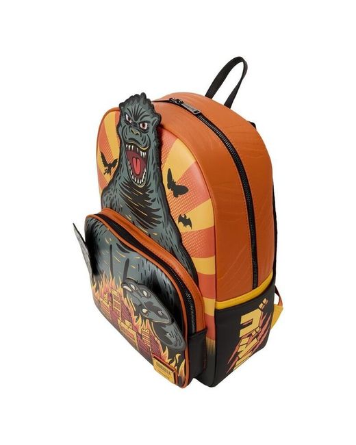 Head to your stomping grounds in style. An applique of Godzilla’s head rises up over the front pocket, which displays a print of a city under siege and fire. Godzilla’s claws reach forward, and his arms move on rivets!