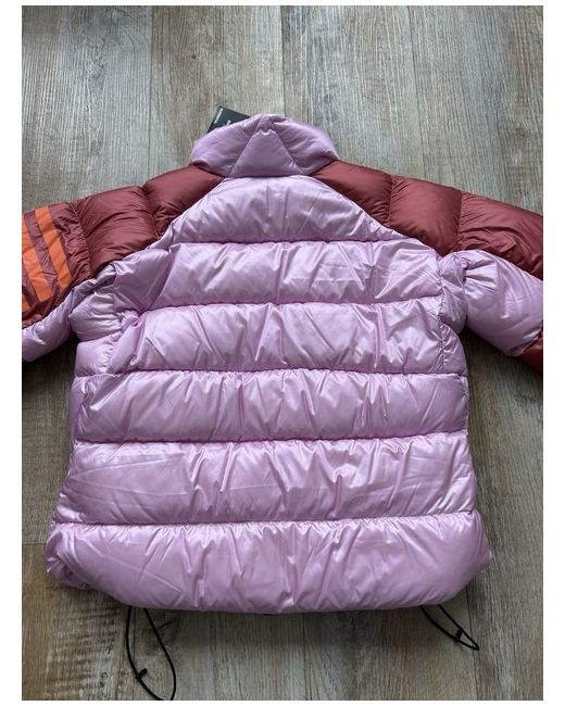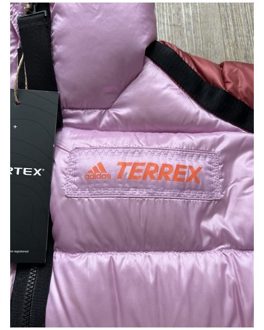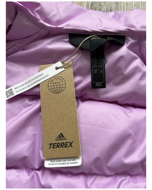 The jacket in the image is the Adidas Terrex Utilitas Down Jacket in the "Bliss Lilac/Wonder Red" colorway. It is a technical down jacket designed for warmth and comfort in cold and windy conditions. Product Details Fill: 600-fill duck down (80% duck down, 20% feather) for high-loft insulation. Shell: Made with Pertex Quantum GL 100% nylon plain weave fabric, which is lightweight and wind-resistant. Weather Resistance: Features a PFC-free water-repellent finish to resist wind and rain. Design: Has a relaxed fit, a two-way full-zip closure with a stand-up collar, and zip pockets.