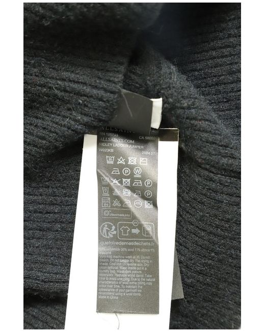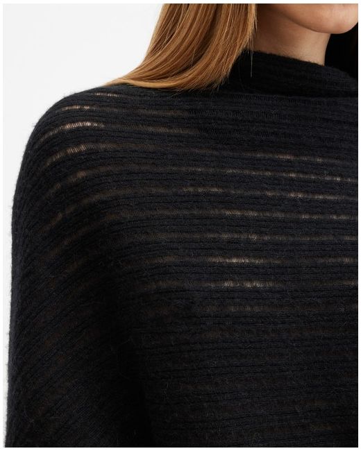 This AllSaints Ridley Ladder Jumper in black features a relaxed, slightly batwing silhouette with ribbed sleeves and subtle see-through horizontal ladder details in the knit, creating a semi-sheer effect.