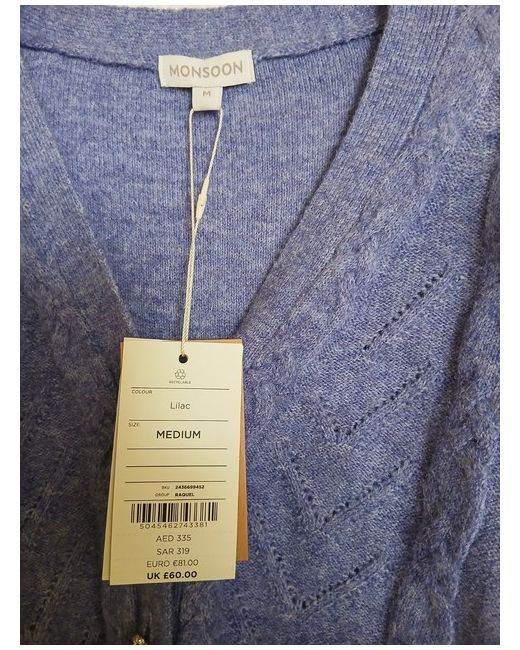 The Lilac Monsoon Cardigan in Medium size is a stylish addition to any woman's wardrobe. Made from a tight-knit fabric, this cardigan features a V-neckline and long sleeves, frill on the shoulder tops making it perfect for a casual occasion during the autumn season. The solid lilac colour adds a touch of elegance, while the regular fit ensures a comfortable and flattering silhouette. Diamonte buttons
