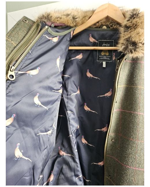 The Joules Tweed Field Jacket in size 20 is a stylish and practical mid-length jacket perfect for casual occasions during the winter season. Made from wool tweed with a polyester lining and insulation, this green jacket from the brand Joules offers a regular fit for a comfortable and fashionable look. With its classic basic jacket style with removable fur collar and gilet which can be worn separately, practical features, this jacket is a versatile and timeless addition to any woman's wardrobe.