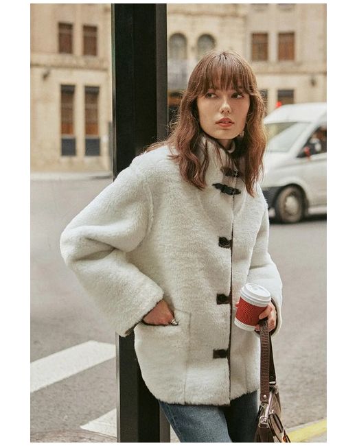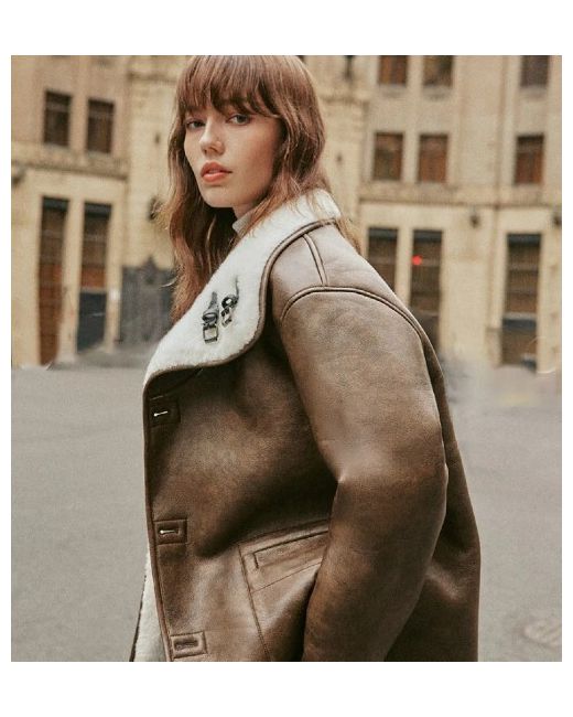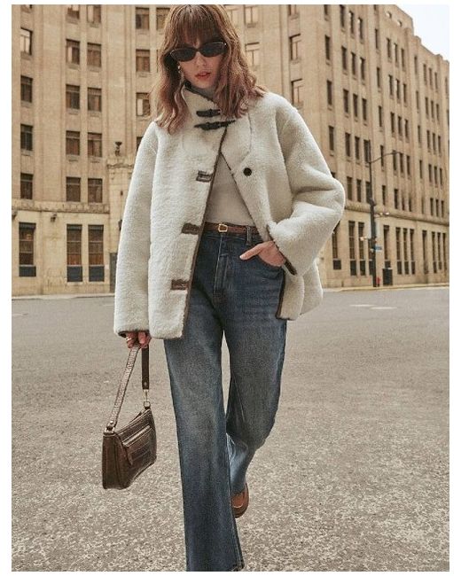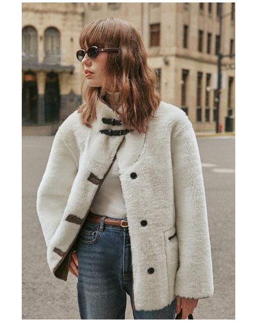 Reversible dual-textured jacket. Fabric 1: 100% Polyester (Faux Fur). Fabric 2: 100% Polyurethane (Faux Leather). Model is wearing size XS, height 5'4", weight 103 lbs. Elegant stand collar with faux leather buckles.
