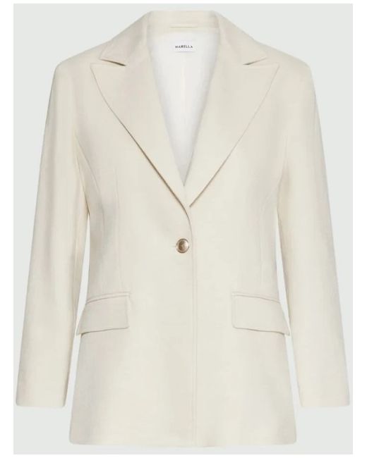 TheMarella “Sacca” blazer is tailored in abasketweave textured fabric with a smooth satin lining. Featuring asingle‑button closure ,notched lapels ,front flap pockets, anddecorative sleeve buttons, this jacket embodies Italian elegance and versatility.