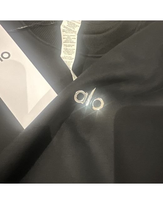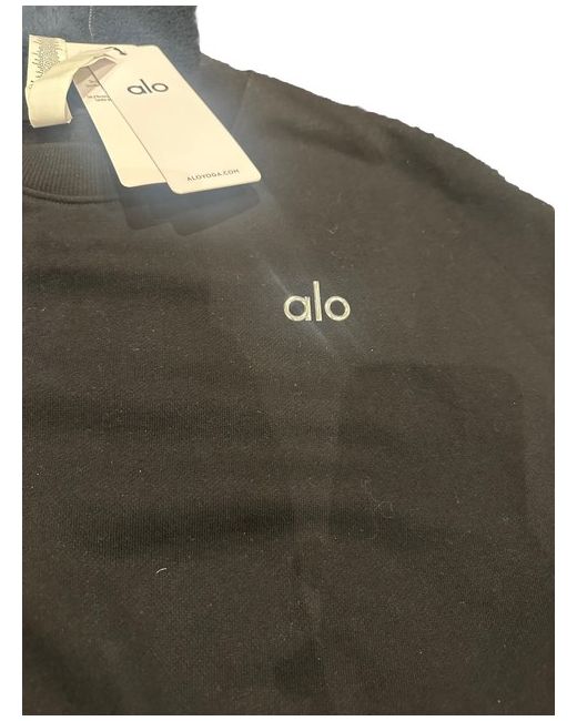 The Alo Accolade Women's Crew Neck Pullover in size S uk 8 10 12 oversize is a stylish black sweatshirt made from comfortable cotton material. With long sleeves and a hood, it is perfect for activewear, especially for yoga. The crew neck and logo accent add a touch of detail to this regular fit pullover from the ALO brand. Easy to care for with machine washable instructions, this sweatshirt is a versatile and fashionable addition to any woman's wardrobe. fleece lined warm