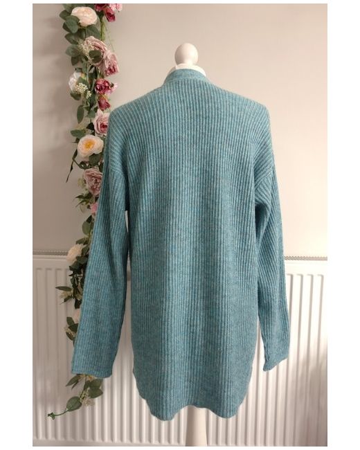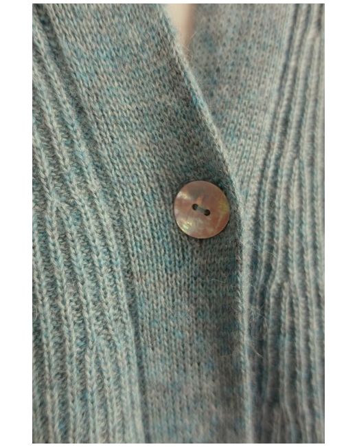 Deep v-neck; drop shoulders; contrast rib trim. Beautiful mother of pear buttons. Pima Cotton (57%), Baby Alpaca (26%), Nylon (15%) Wool (2%). blue/sea green and grey marl fine ribbed knit Boyfriend cardigan.