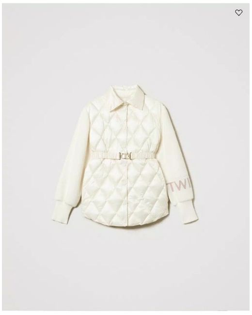 Short puffer jacket made from satin-like lightweight shiny nylon with diamond quilting. Long knit sleeves with contrasting lettering logo, shirt collar, tonal snap button fastening, elasticated belt with varnished metal Oval T buckle, rounded at the hem, straight fit.