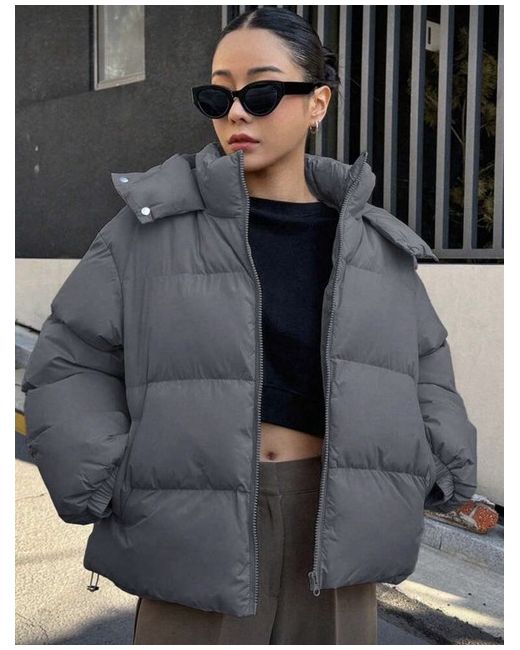 DAZY Solid Color Hooded Padded Coat,Ladies Winter Casual Pocket, Zipper Drop Shoulder Hooded Loose Dark Grey Plain Women Winter Coats, Winter Warmth/ Winter Fashion Winter Women Clothes, Winter Coat Women Jacket