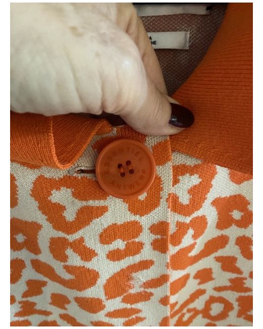 Beautiful long multi coloured jacquard knitted front button coat by Essentail Antwerp. Long sleeves, in leopard print in shades of Orange, Pink, Cream & Brown. This is cut loosely so easy to wear over a thick jumper and jeans with Orange formal collar. This has never been worn, but has the slightest of marks on one piece of leopard marking - (photo attached) Would fit a 14 or 16. Size: XL by Antwerp which is a 14 but as it is so loosely cut would fit 14 or 16. Paid £300 when bought so a real bargain