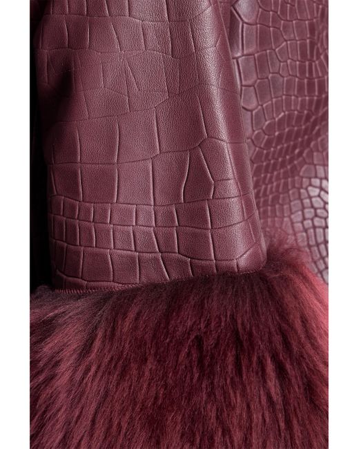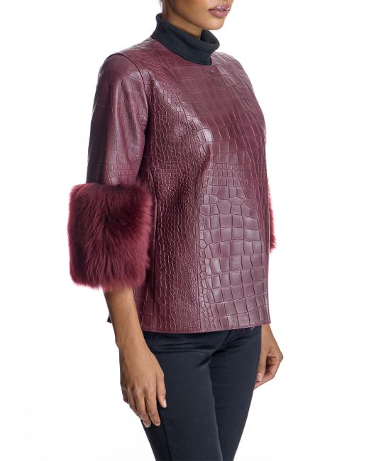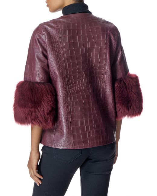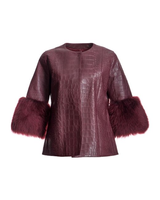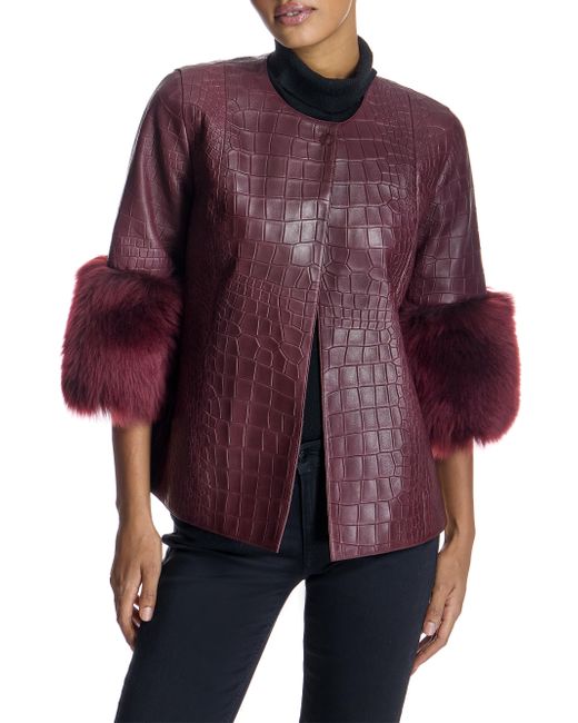 From the Maximilian collection women's leather jacket. Straight 3/4 Sleeves with Dyed Shearling Lamb Trim Collarless Collarless Top Snap Closure Material: Dyed lamb leather and dyed toscana shearling lamb trim Fur type: Shearling Lamb Fur treatment: Dyed Fur origin: Turkey Dry clean Imported SIZE About 24'' from shoulder to hem Model measurements: 5'10'' tall Model is wearing a US size Small. Furs - Fur Salon Direct > Maximilian > Saks Fifth Avenue. Maximilian. Color: Burgundy. Size: Small.