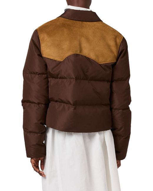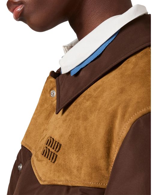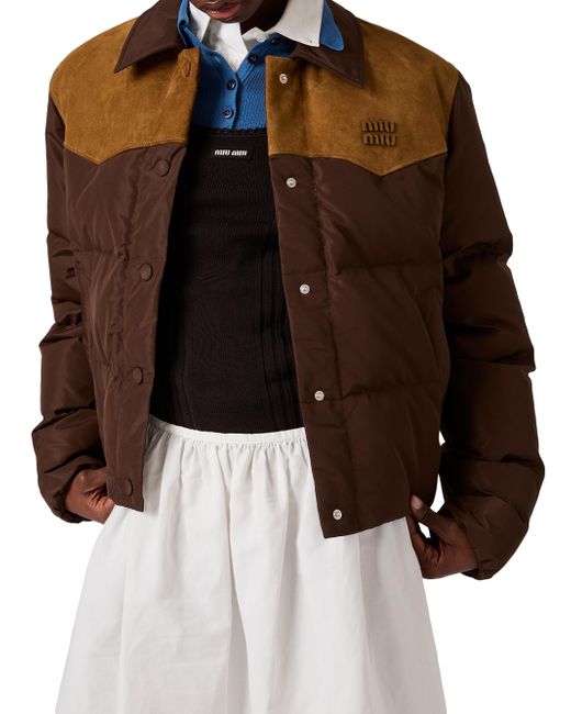 Medium-weight Goose down padding Shirt-style collar Long sleeves Elasticized cuffs Fabric-covered snap closure Welt pockets Elasticized drawstring hem Leather details Leather logo Imported 100% recycled polyester - 100% calf leather. Lsd Handbags - Miu Miu > Miu Miu > Saks Fifth Avenue. Miu Miu. Color: Brown. Size: 4.