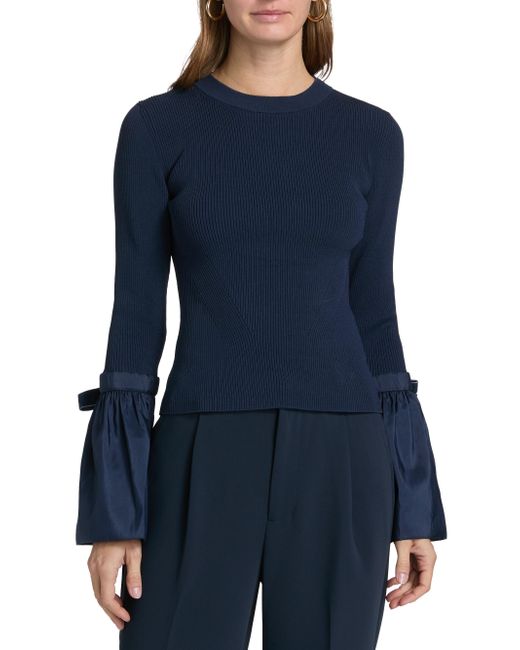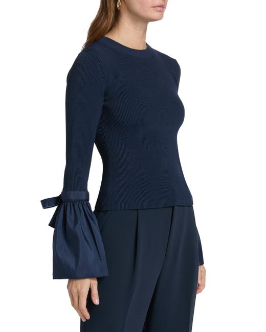 Cut for a fitted shape, this Agata top from SIMKHAI features bell sleeves with velvet bow-detailed taffeta flared cuffs. Crewneck Bell sleeves, flared cuffs Pulls over 83% viscose/17% elastane Contrast: 60% polyester/40% nylon Lining: 100% nylon Dry clean Imported SIZE & FIT This style is constructed in a stretch fabric for a slim fit About 21.5" from shoulder to hem Bust: about 35" Model measurements: 5'10" tall Model is wearing a US size 4. Contemporary Sportswear - Workshop > Simkhai > Saks Fifth Avenue. SIMKHAI. Color: Midnight. Size: XS.