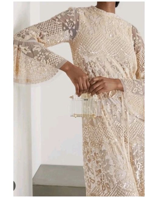 NEEDLE and THREAD Snowdrop Sequin Embellished Tulle Gown Pearl Rosepink UK 12 Needle & Thread's Snowdrop gown radiates femininity and romance. Crafted in tulle with flared sleeves and an optional belt to cinch the waist, it is elaborately embellished with vintage lace-inspired floral sequin embroiderySequin embroidered tulle • Detachable waist tie • Keyhole with button fastening at centre back neckline • Lined • 100% polyester • Delicate dry clean • Made in India