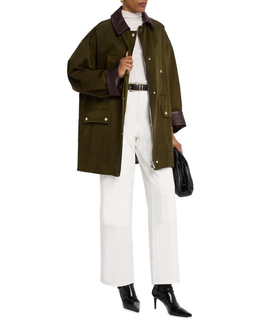 A.L.C.'s Theo barn jacket is crafted of a nylon and cotton canvas with faux leather trim at the point collar and rolled cuffs. Various snap-flap pockets lend added structure and comfort to this style. Point collar Dropped shoulders Long sleeves, rolled cuffs Chest snap-down vertical flap pockets Side snap-flap pockets Double-vented back Front two-way zip closure, snap storm placket Nylon/cotton Lining: Cotton Dry clean Imported SIZE & FIT Model measurements: 5'10" tall Model is wearing a US size Small. Contemporary Sportswear - Workshop > A.l.c. > Saks Fifth Avenue. A.L.C.. Color: Dark Green. Size: XS.