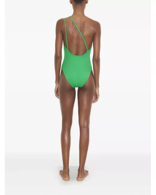 jade green paisley print one-shoulder design Be mindful to try on swimwear over your own garments.