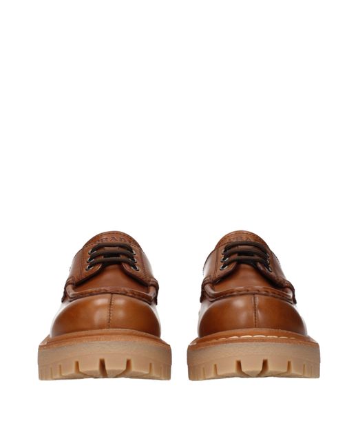 Description: The product with MPN 1E802N070045F0046 and code F84310 leather in brown is a lace up and monkstrap designed by Prada. It has features like front logo, back logo, vintage effect, aged effect.