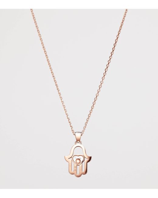 In its Good Luck collection, Chopard explores a range of lucky symbols and renders them in solid gold with glittering embellishments. In the case of this 18-karat rose gold necklace, a Hamsa Hand motif hangs from a slender chain and is set with a round-cut white diamond encased in a sapphire crystal case.