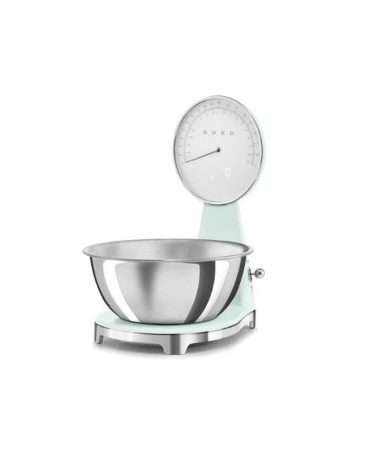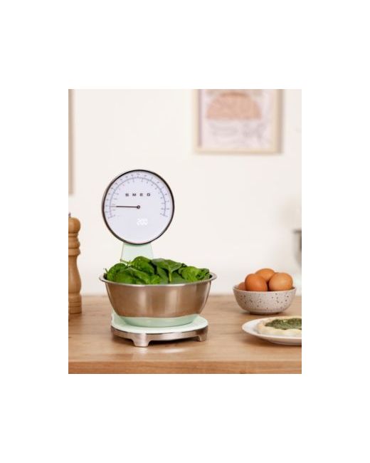 Presenting a retro aesthetic, this Smeg kitchen scale features a removable stainless steel bowl and a dial with Led display. An automatic shut-off and Usb-c charging offer modern convenience. Available models include KSF01BLUS, KSF01CRUS, KSF01PBUS, KSF01PGUS, KSF01RDUS, and KSF01WHUS.