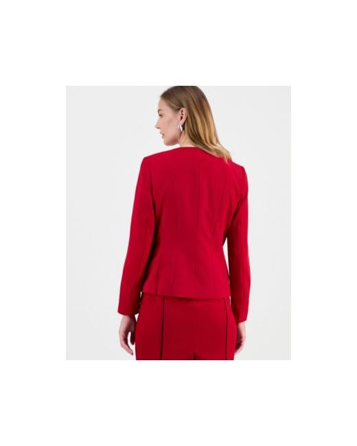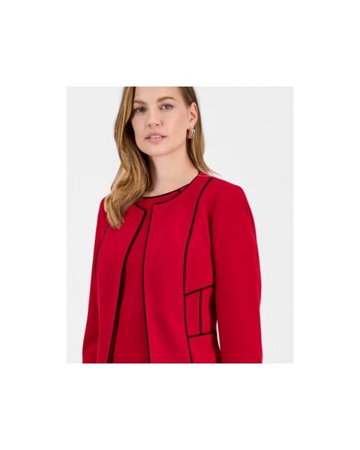 Kasper's crewneck jacket features a structured silhouette with an open front, enhanced by contrasting piping for a polished and refined touch to the classic design.